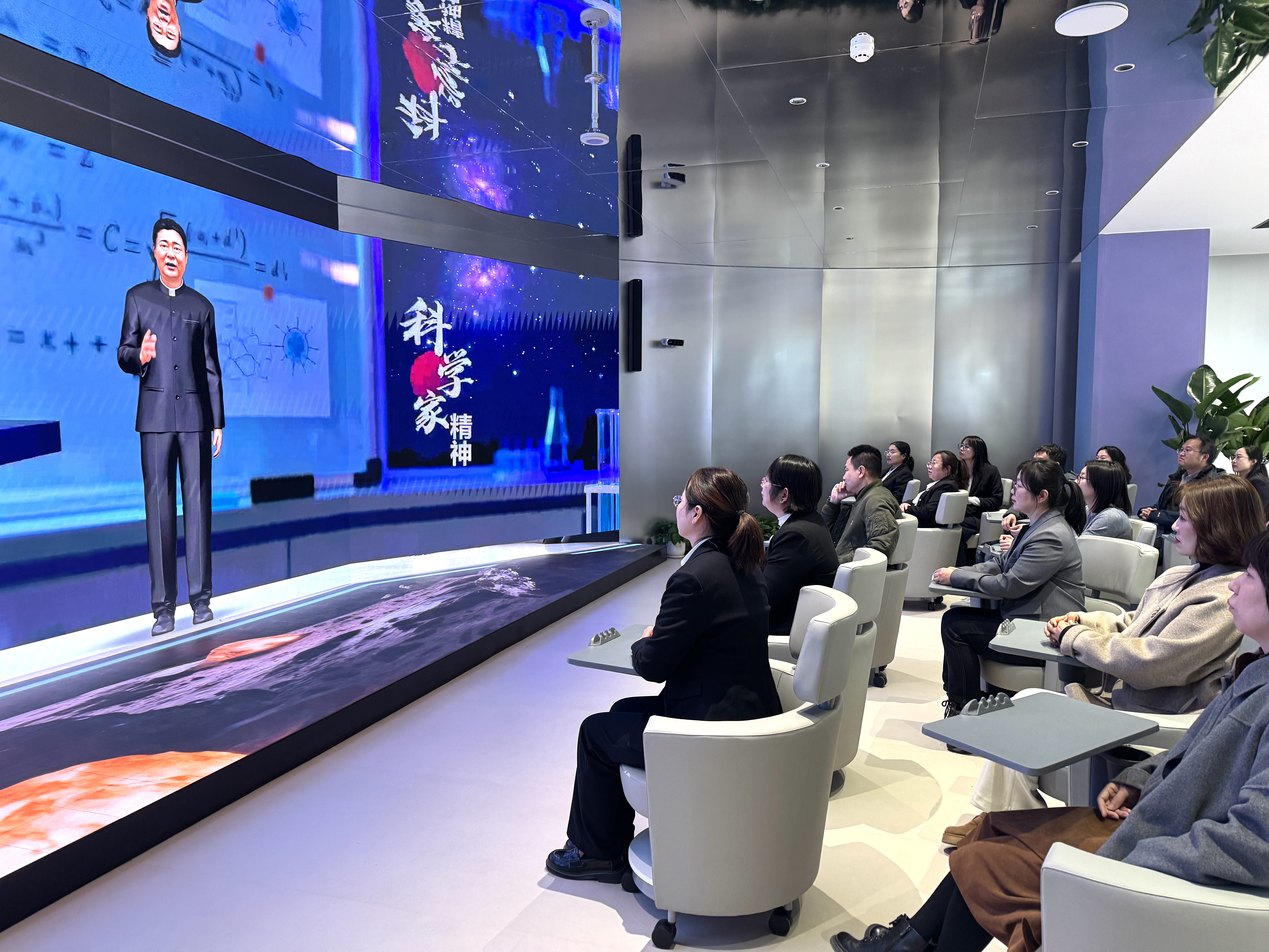 随后,组织员刘欣欣围绕中心七大功能区域,为党员们进行了系统细致的讲解。在“时代伟绩区”,大家通过触控屏与数字人平台,直观感受新时代中国在文化、科技、交通等领域的伟大变革,进一步坚定了“四个自信”;在“育人品牌区”,深入了解学校“科创砺能,启智笃行”育人品牌及PEIM教育模式构建的“能力培养+价值引领”育人闭环;在“五育成效区”,数字化呈现的志愿服务时长、竞赛获奖成果、实训基地建设等数据,生动展现了学校五育融合的育人实效。
